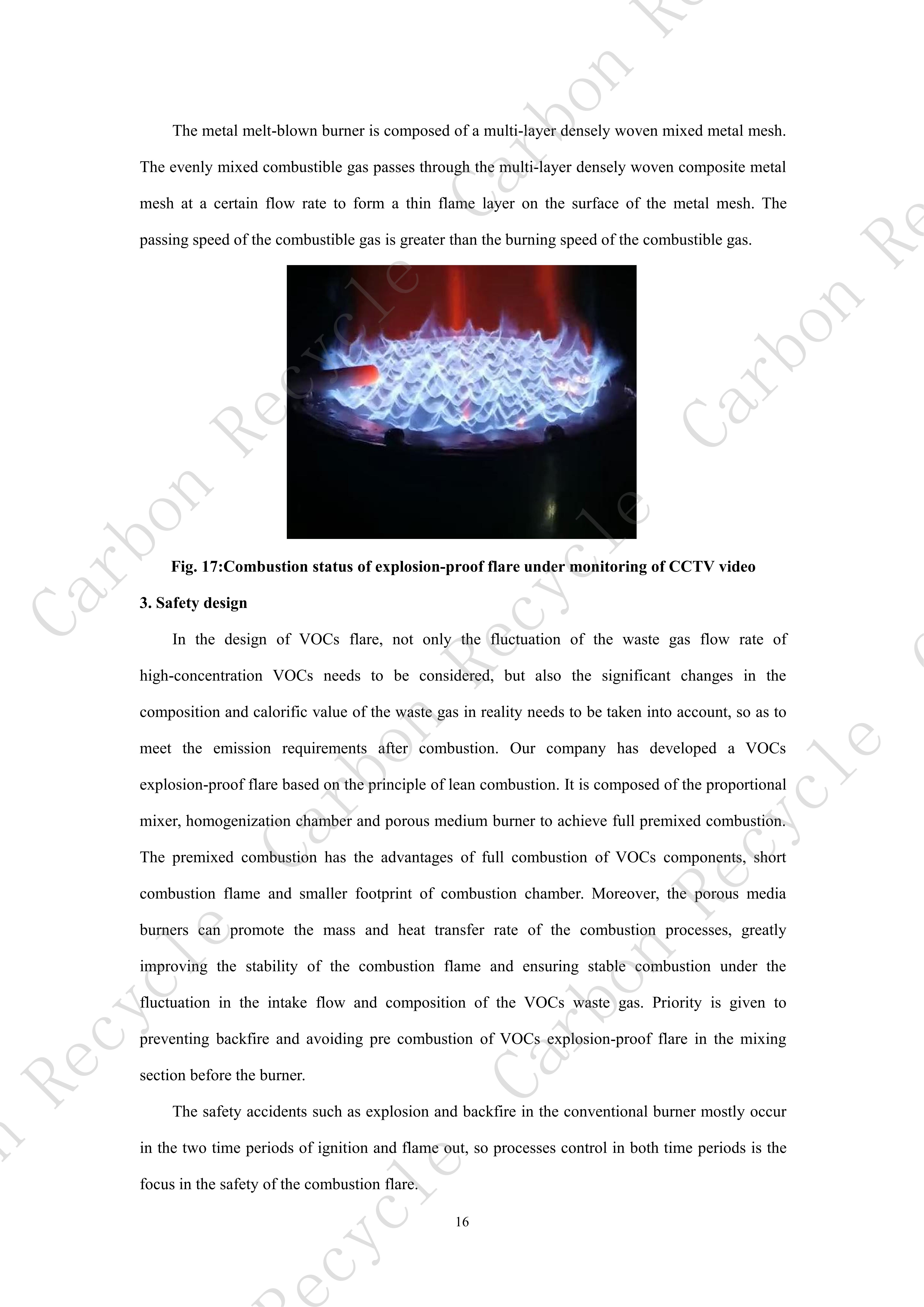 The explosion-proof flare falls into the category the destructive combination of VOCs (Category B). Compared with the Regenerative Thermal Oxidizer (RTO) and Regenerative Catalytic Oxidizer (RCO) of the same category (Category B), it features higher safety in use, which has three most important safety features: