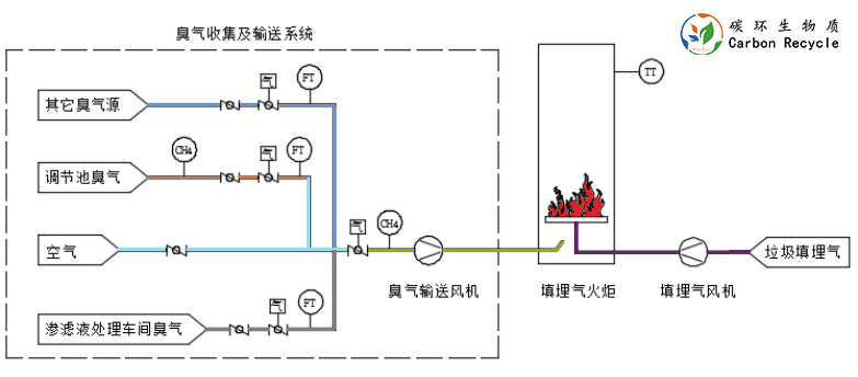 公司在武漢某垃圾填埋場原有填埋氣火炬改造,目的是利用新火炬系統(tǒng)在燃燒填埋氣燃燒產(chǎn)生的熱量,對于填埋場滲濾液處理設(shè)施產(chǎn)生的臭氣進行熱氧化除臭。垃圾滲濾液調(diào)節(jié)池及垃圾滲濾液處理車間產(chǎn)生的臭氣集中收集后用管道通過風(fēng)機輸送至火炬配風(fēng)口混入火炬焚燒。在臭氣管道上設(shè)置氣體濃度分析儀、緊急切斷閥等安全保護裝置,保護裝置與輸送風(fēng)機、火炬連鎖控制。